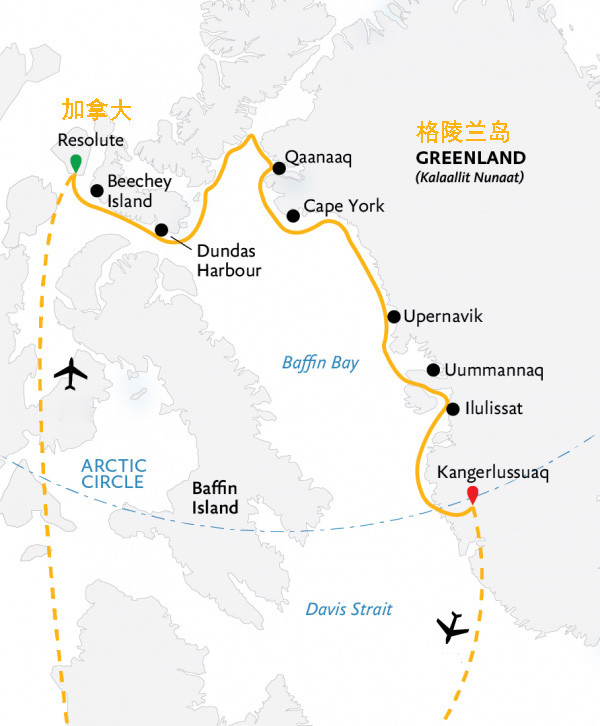 5. 加拿大巴芬岛Baffin Island以及北部海岸线,一般挪威特罗瑟姆出发,经斯瓦尔巴德,格陵兰,冰岛,一路沿加拿大北部海岸线往西走。