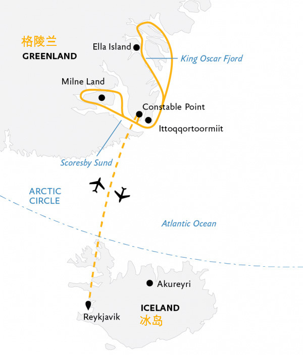 很多路线会结合斯瓦尔巴德、格陵兰、冰岛或者挪威,选择其中2个或者3个作为目的地,船期通常12-18天左右。以下图为例: