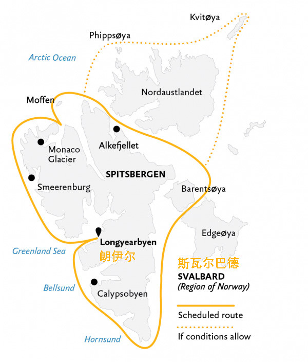 挪威领土,人类最北的聚居地,北极熊比人类多的岛屿。可以飞到朗伊尔登船。船期8-13天不等,有些是走西部和北海岸,稍长的船期可能会大环岛。大致如下图: